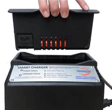 パワーハンドラーのパワフルな 5Ahバッテリーパックは、ワイヤーやプラグを接続することなく、簡単かつ迅速にバッテリーを交換することができます。