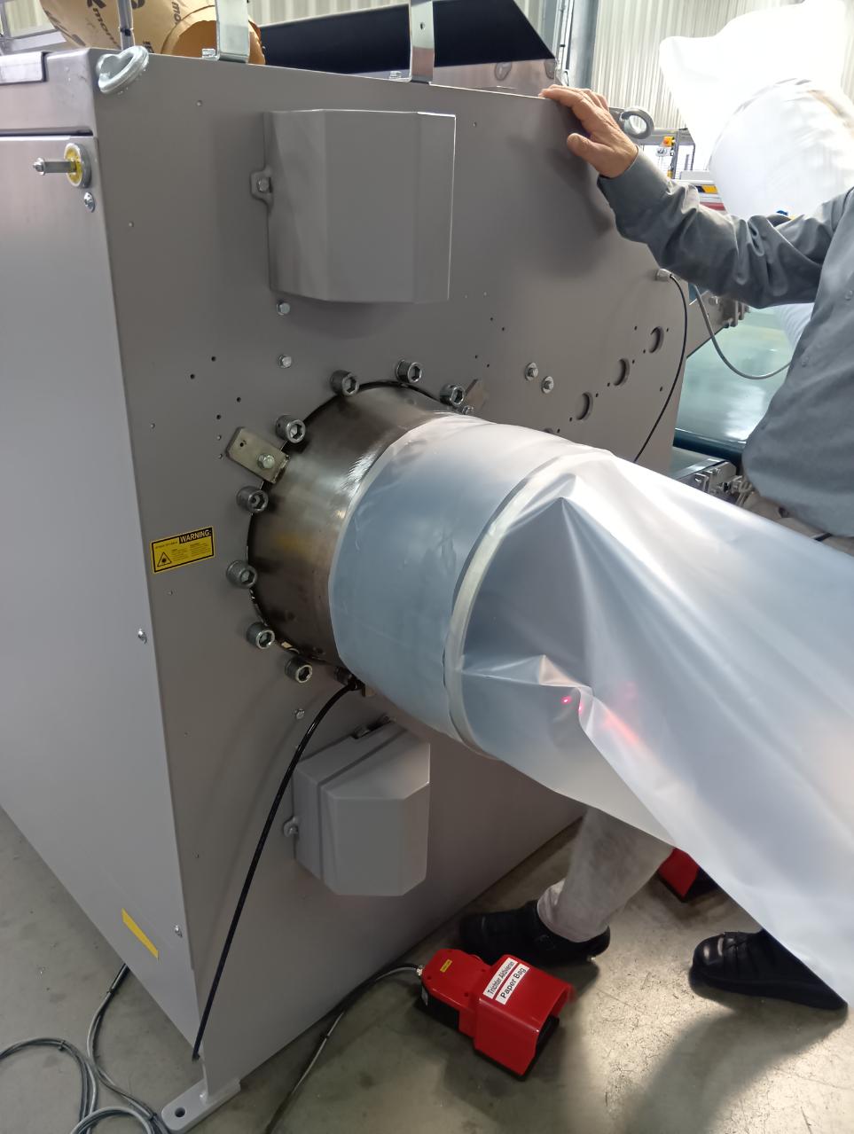 ・製品圧縮後はノズルより排出されるため、梱包袋をノズルにセットして頂き、プッシャーと呼ばれる製品を押し出す棒の力を利用して、梱包袋に収納する流れになります。
