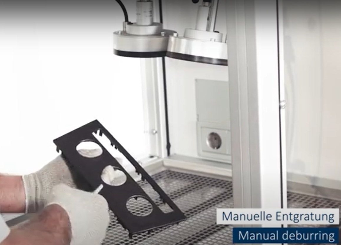バリ取り作業の後にクリーンボックス内で清掃する例です。
